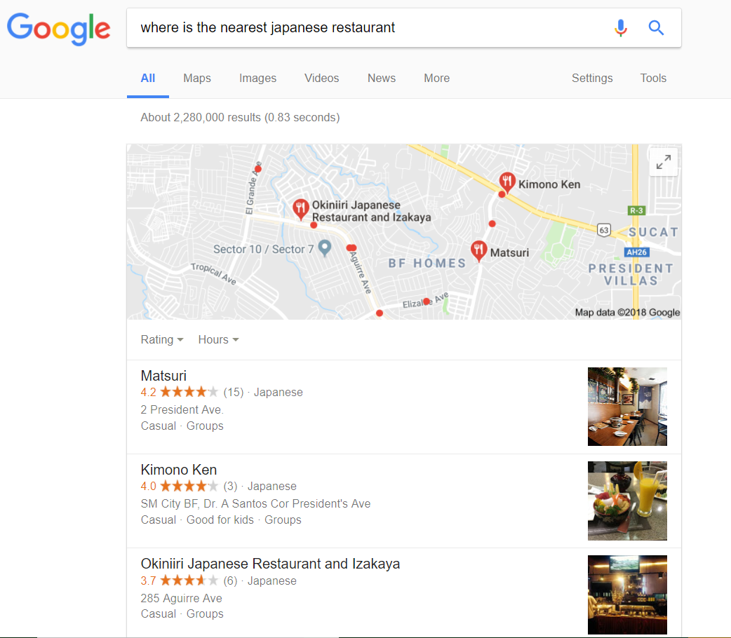 Based on this infographic, both teens and adults commonly use voice search to ask for directions, call someone, and check out movie times. For those with businesses, one of the most important strategies that need to be done would be to have your business listed on Google My Business, as local results tend to come up the most in location-based voice searches. For example, when I came looking for the nearest Japanese restaurant, businesses that have Google My Business are the ones that popped out first.