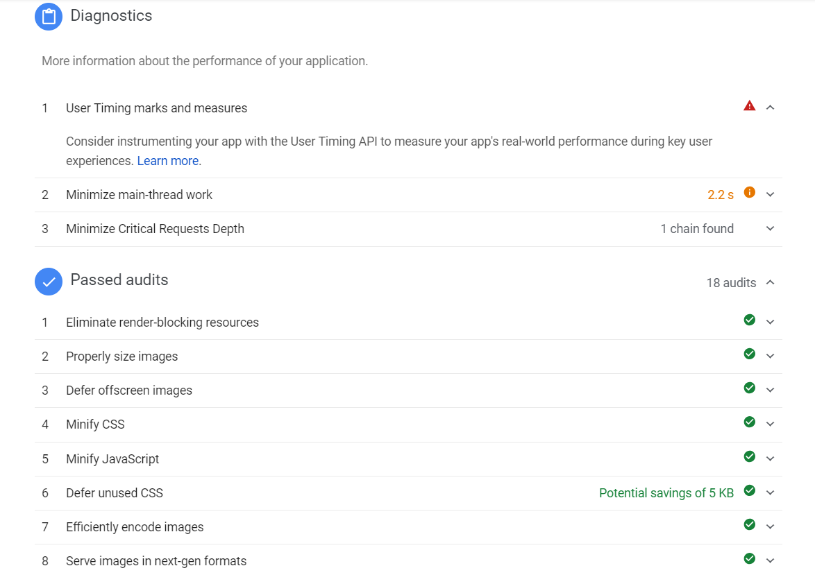 For example, I get to see the audits that passed, allowing me to see the things we did right to improve page loading performance.