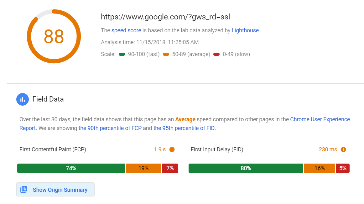 The first set of data presented is Field Data, which shows the average loading speed of a web page over the past 30 days. This data takes into account the findings that have appeared in the Chrome User Experience Report. You can view the number of pages that have experienced various loading speeds, giving you a better idea of how your page loads on different kinds of internet speeds.