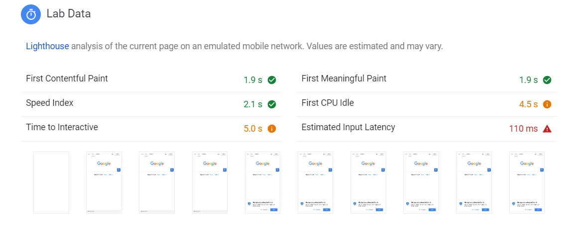 Lab Data is data pulled from Google Lighthouse analysis. This data shows the amount of time it takes for the web page to reach a certain stage. There are six stages being evaluated, all of which affects page performance and user experience.