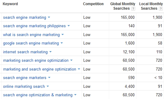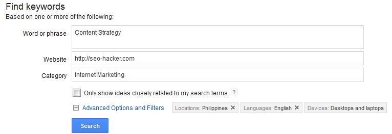 Check it out – the local and global monthly search volume can be easily checked with the Google Keywords tool. If the keywords your users are searching for has a good number of monthly searches, put them into your list and start training your content to sniff it out.