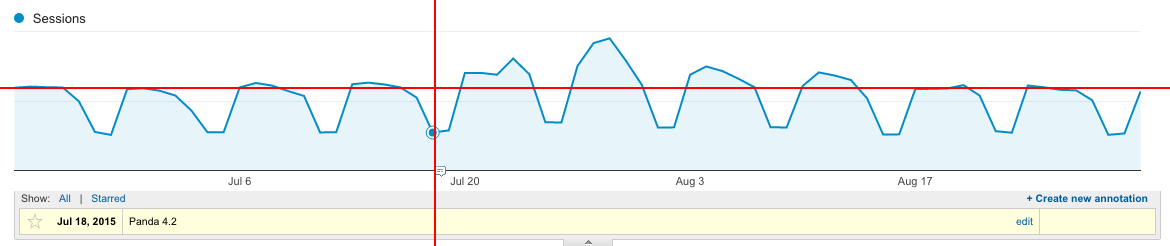 The vertical red line is the Panda release and the horizontal line is showing Barry’s pre-Panda 4.2 Google organic traffic and how it returned to the same level.