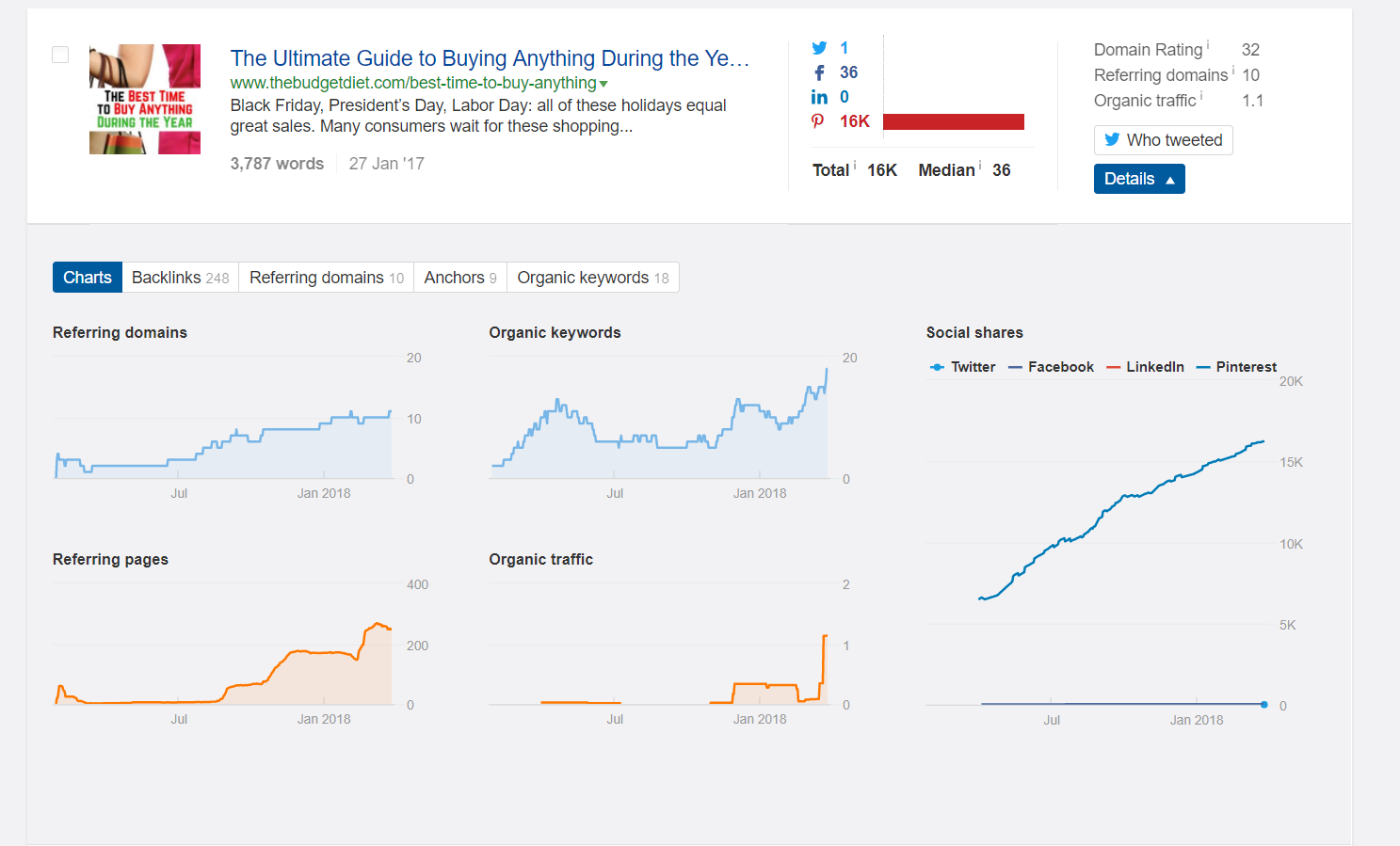 Once you have found content that you would like to view and analyze further, clicking the “Details” button allows you to look into more statistics. This section allows you to view backlinks, anchors, referring domains, and organic keywords. You can view each section individually to view more data, which allows you to explore and discover even more content that you can use as a reference.