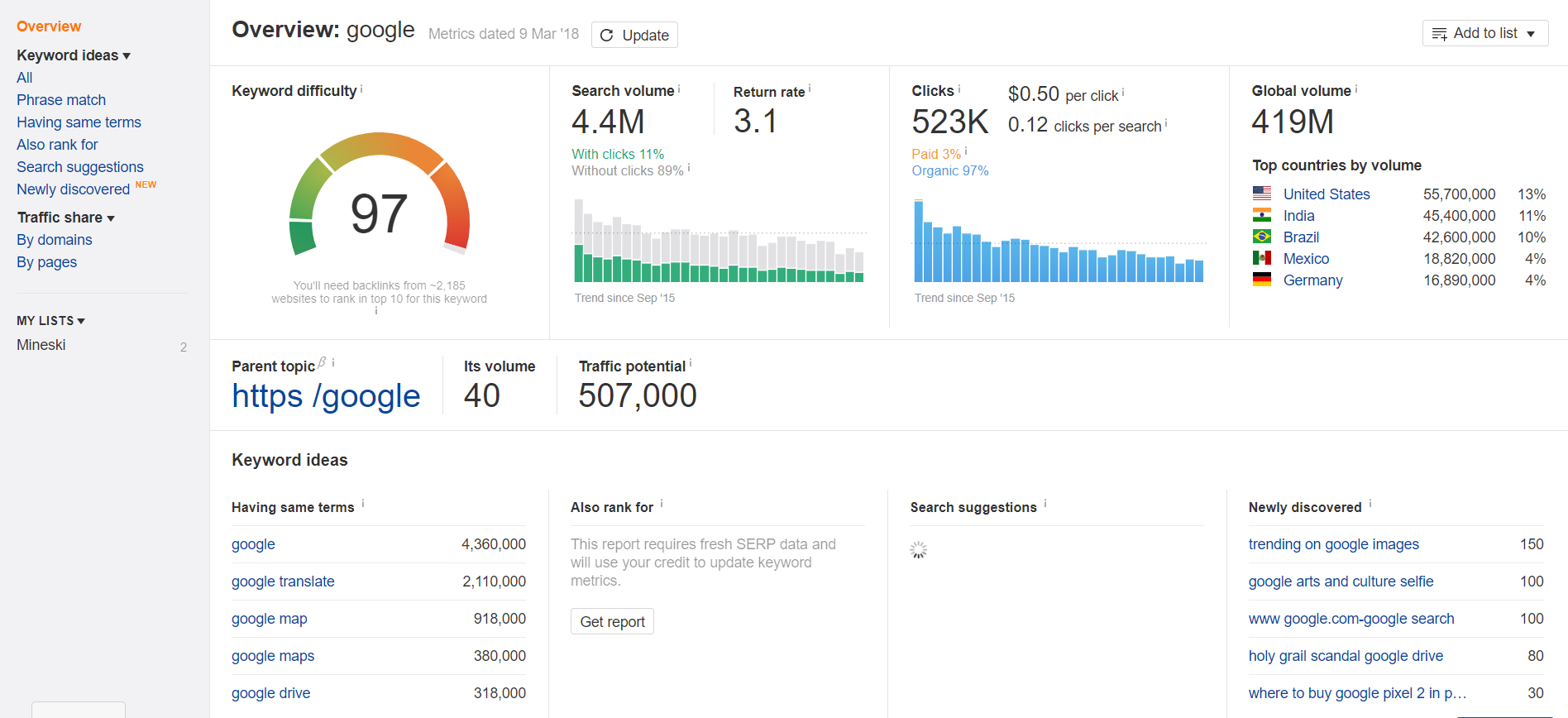 To get started with doing keyword research, all you have to do is to access the Keyword Explorer. From there, you would be able to enter a certain number of keywords. For this example, I’ll be entering “Google” as my keyword to get things going.