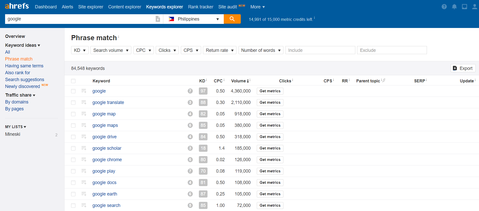 Along with getting the overview of keyword search volume, you also get to look similar keywords and phrase matches even further. Phrase Match allows you to view related keywords, along with important details such as search volume and cost per click.