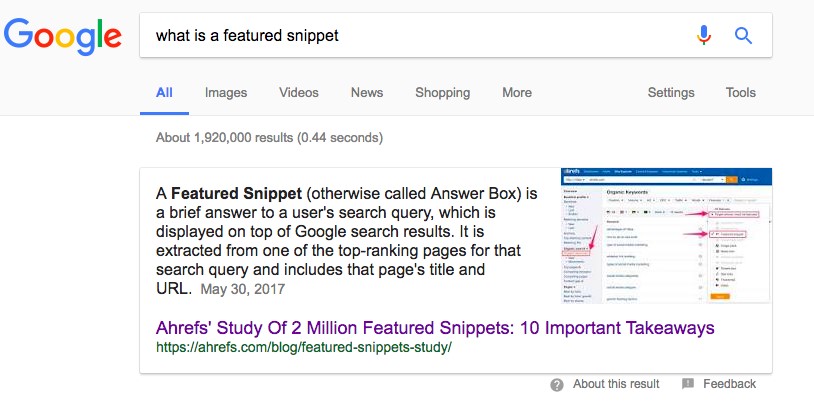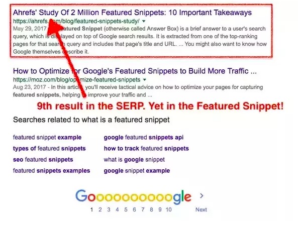 On the long-tail query “what is a featured snippet”, Google is using the content coming from Ahrefs.com even though it is ranking 9th in the SERP.