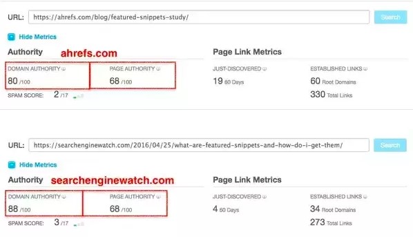 Yet this is not the primary reason you want to target the featured snippet. For instance, when I compared Ahrefs and Search Engine Watch’s domain and page authority with Open Site Explorer I was stunned with the results: