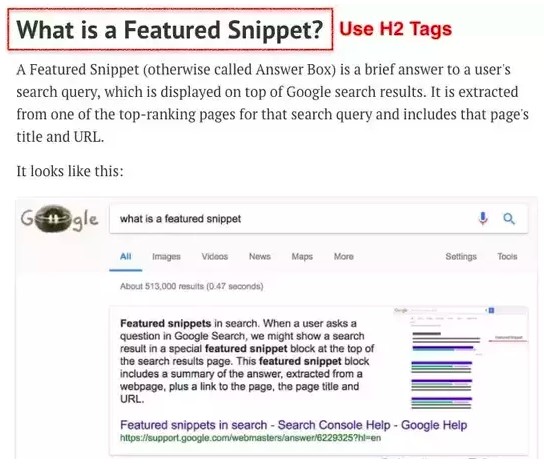 That is also how the article managed to rank for that featured snippet. The most effective heading to use for the snippet is H2: