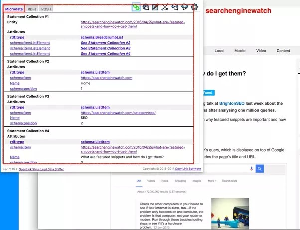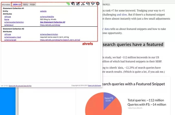 I used a Google Chrome extension called open link structured data sniffer to see what kind of data both Ahrefs had on-page compared to Search Engine Watch.