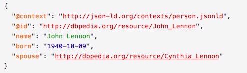 To keep things short, JSON-LD allows open data to be linked. For instance, to say “John Lennon’s spouse is Cynthia Lennon” the JSON-LD expresses it as it follows:
