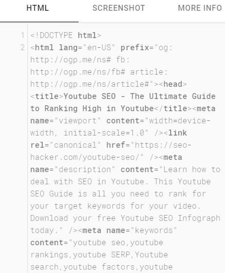 The HTML section is pretty straightforward, allowing you to view the web page code, which can help you track various page elements like H1 tags and tracking codes.