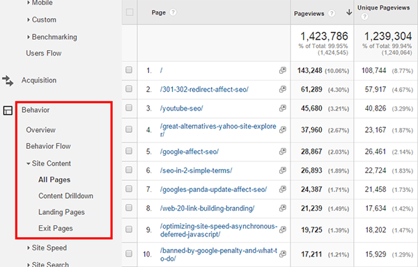 To do this, go to Behavior, then Site Content and choose All Pages.