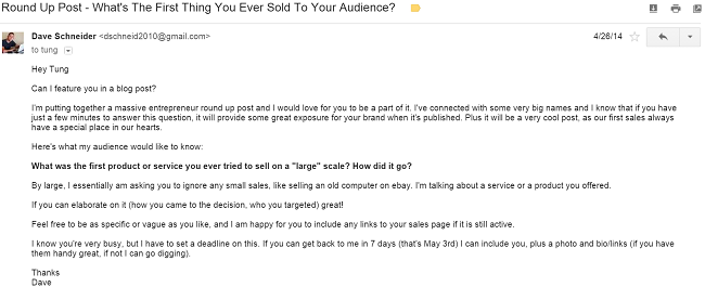 I always recommend making a list of burning questions in your niche, and then seeing if some variation of those would make for an interesting roundup post. In the business niche, entrepreneurs are always wondering how to make their first sale, so I turned that into a post.