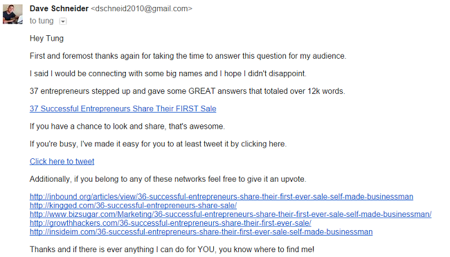 In addition to the traffic, link building, and social shares I’ve received from the post I organized, I’ve also gotten a podcast invite, a guest post on my blog, and networked with a bunch of important people in my niche.