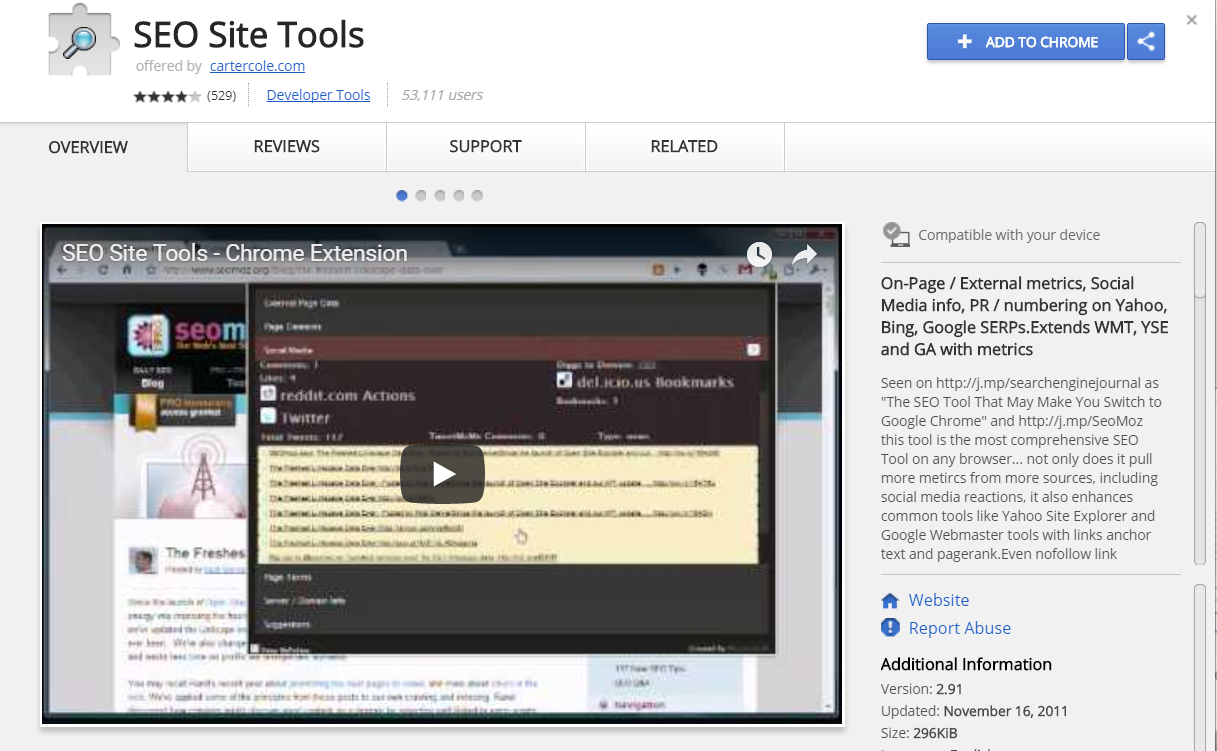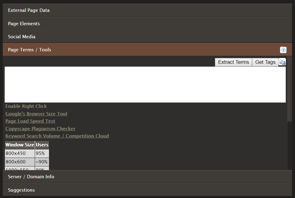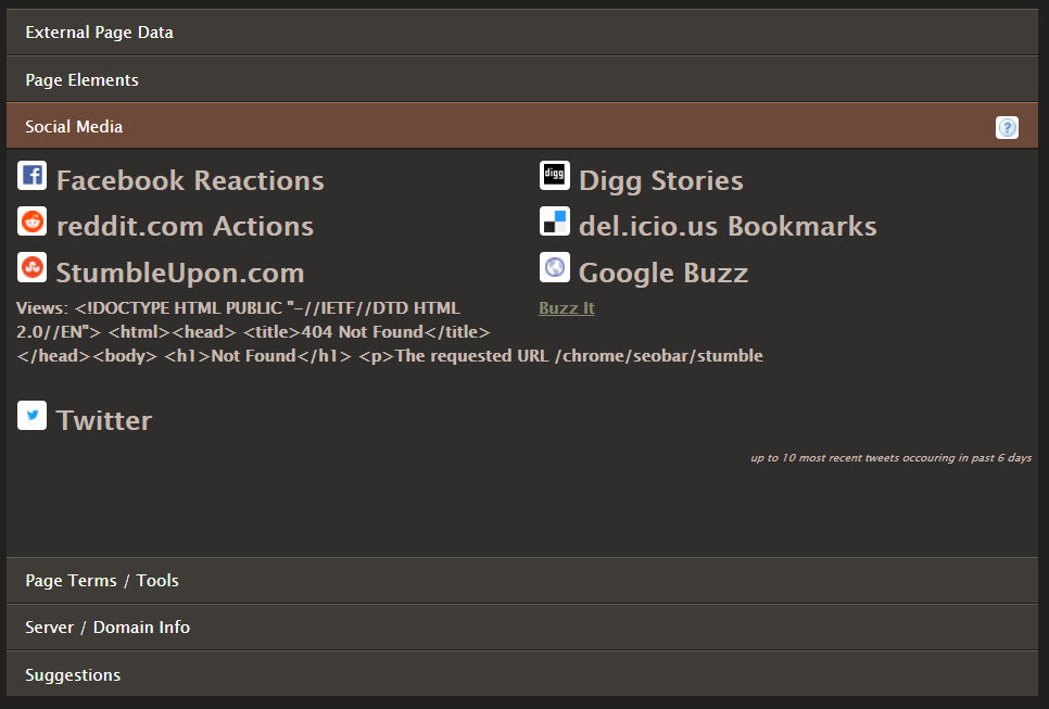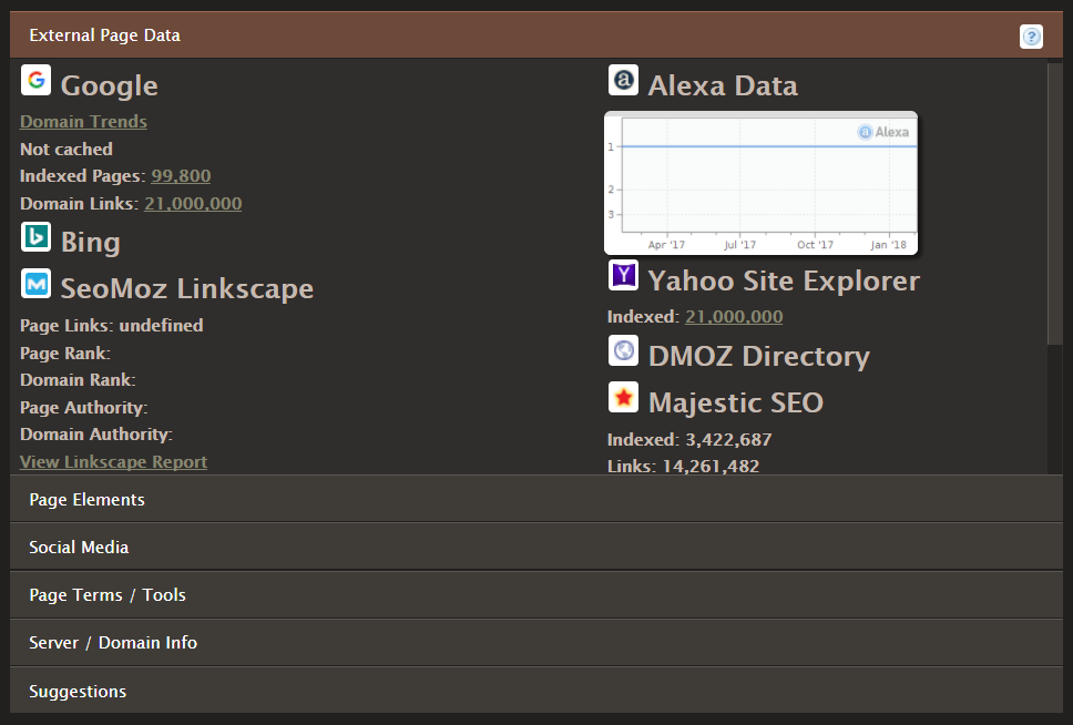 Starting off, we have one of the more versatile tools available for Google Chrome with SEO Site Tools. This handy extension has 6 sections which provide you with essential website data for your SEO needs. These sections include External Page Data, Page Elements, Social Media, Page Terms and Tools, Server and Domain Info, and Suggestions.