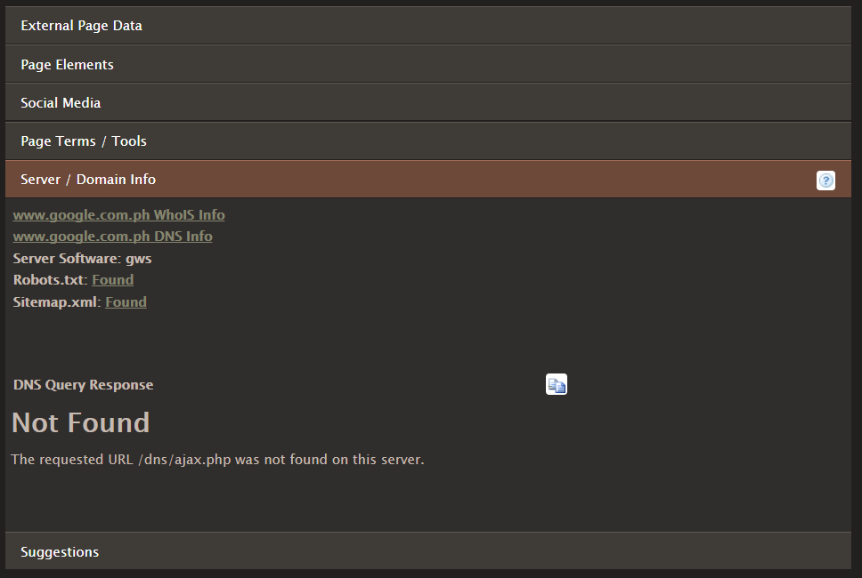 The Server Domain Info looks into the type of server being used in the website, and check for robots and the sitemap. The tool also check the website for DNS Query responses, which is another important piece of information for analytics. Finally, the suggestions section shows you some actions that you can do to improve the performance of your website. The tool also analyzes the strong points of your website, which helps you know the right things that you are doing.