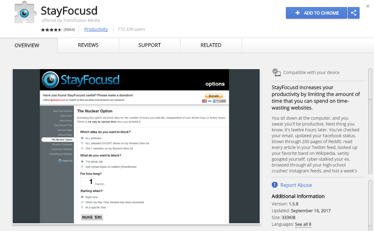 Being productive is crucial to any type of workplace, and eliminating as many distractions as possible would help in working more efficiently. Stay Fosusd is an extension that allows you to restrict the amount of time that you spend on certain websites, and also give you the option to block certain websites entirely.
