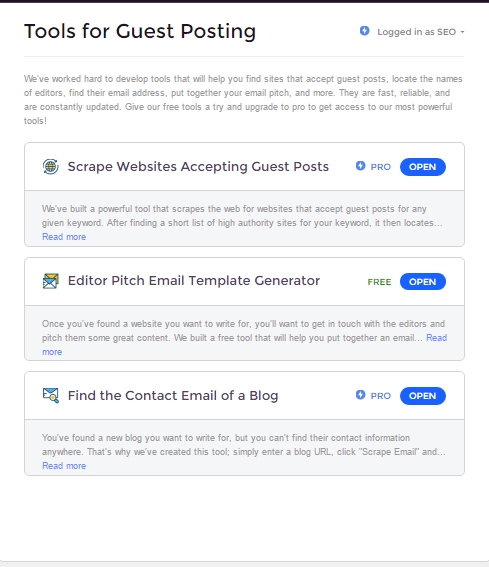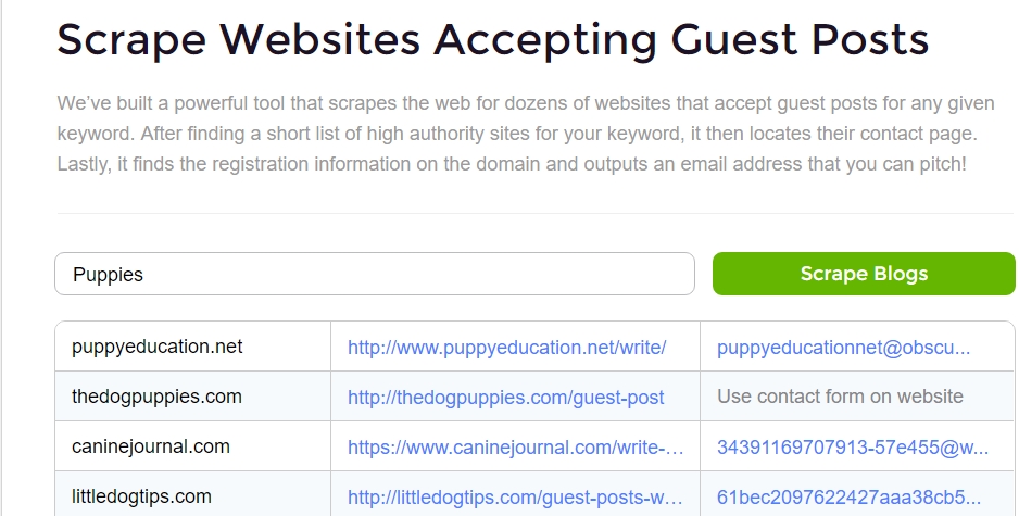 1 Scrape Websites Accepting Guest Posts (PRO) – This is a PRO-only tool that essentially “scrapes the web” looking for websites that accept guest posts for whatever keyword you may think of. The tool essentially targets high authority websites that resonate with your keyword and then locates the best one for you.