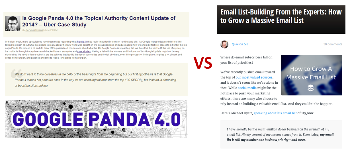 “Is Google Panda 4.0 the Topical Authority Content Update of 2014? – Uber Case Study” vs “Email List-Building From the Experts: How to Grow a Massive Email List”