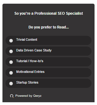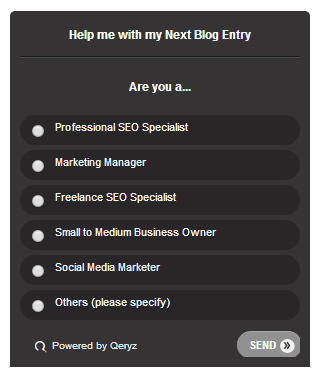 I ran a Qeryz microsurvey here in SEO Hacker and got interesting responses about people’s preference of entries to check out here in our blog. Note that our readers are mostly new to advanced in the SEO world.