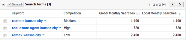 Applying SEO techniques always starts with using the right keywords. Use the Google Adwords keyword tool to identify ‘search terms’ users are most likely to type in when looking for businesses like yours. For instance, you can quickly evaluate whether a searcher is more likely to look for “realtors in Kansas City,” “real estate agent for Kansas City,” or “Remax in Kansas City” so you can use Keyword Targeting most effectively.