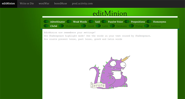 Most writers dread the idea of having to edit their own work. It’s tedious and boring, but it needs to be done if you want your content to shine, and EditMinion is a simple, yet efficient robotic editor which will detect the most common grammar, spelling, structural and stylistic errors.