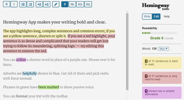 Top-notch content has to read well, and in order to make sure the readability of your articles and posts is up to snuff, you may want to check out the Hemingway app. This effective online tool will improve the readability of your work by highlighting complex and overly convoluted sentences, with suggestions on how to properly shorten them, or even split them into two or several smaller ones. It also detects most writing errors and clichés you’ll want to avoid.