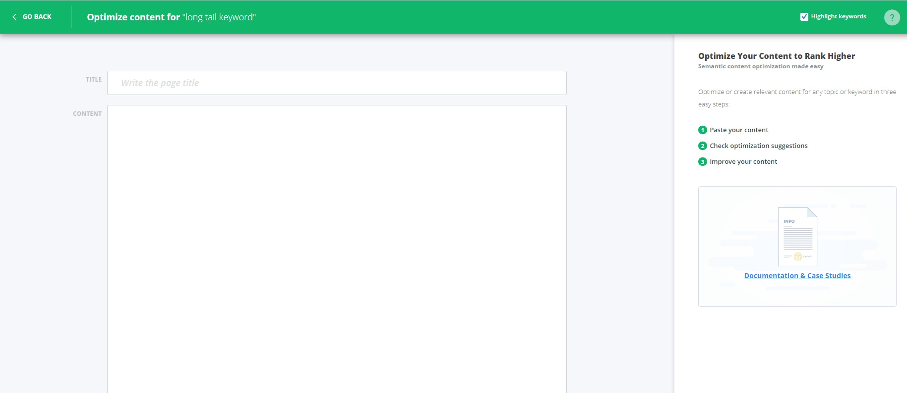 It’s time for the best part about thetool. You can start by clicking on the “Start Optimizing Content” button, then you will be directed to this page:
