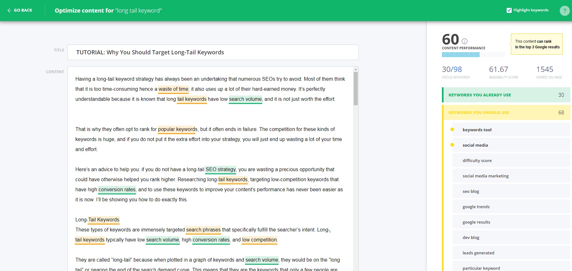 Overall, this is a great tool. It needs improvement but it retains its usefulness because of the content assistant. If you need a little help with optimizing your content, then by all means, use this tool.