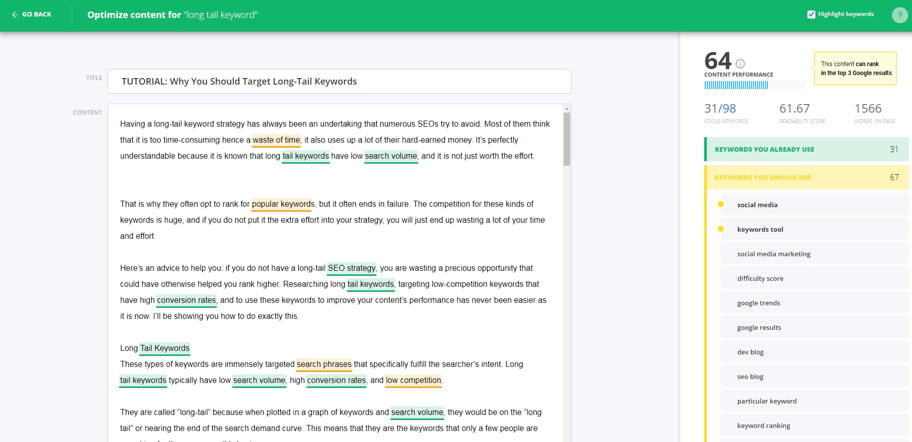 CognitiveSEO’s keyword tool & content assistant has its points to improve on such as the lack of countries in the location filter, unrelated keyword results, and the minor changes (see the instance between “long tail” and “long-tail” above) you have to make if you want to follow the content assistant’s recommendation.