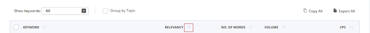 If you are using this tool and don’t have any specific keyword in mind, you can sort the suggestions based on the highest to the lowest characteristic (relevance, no. of words, volume, and CPC). You just have to click on the up and down arrows beside the words on the top of the results.