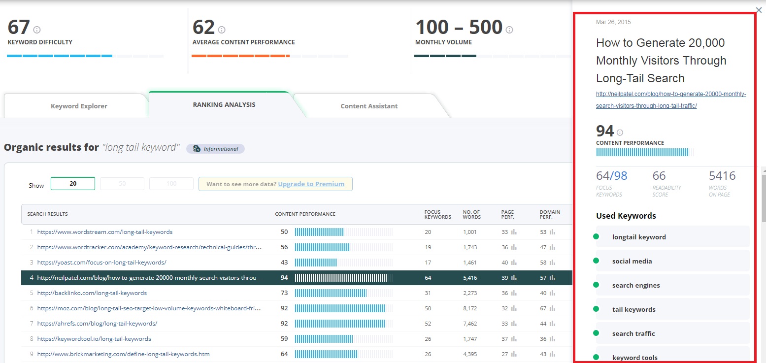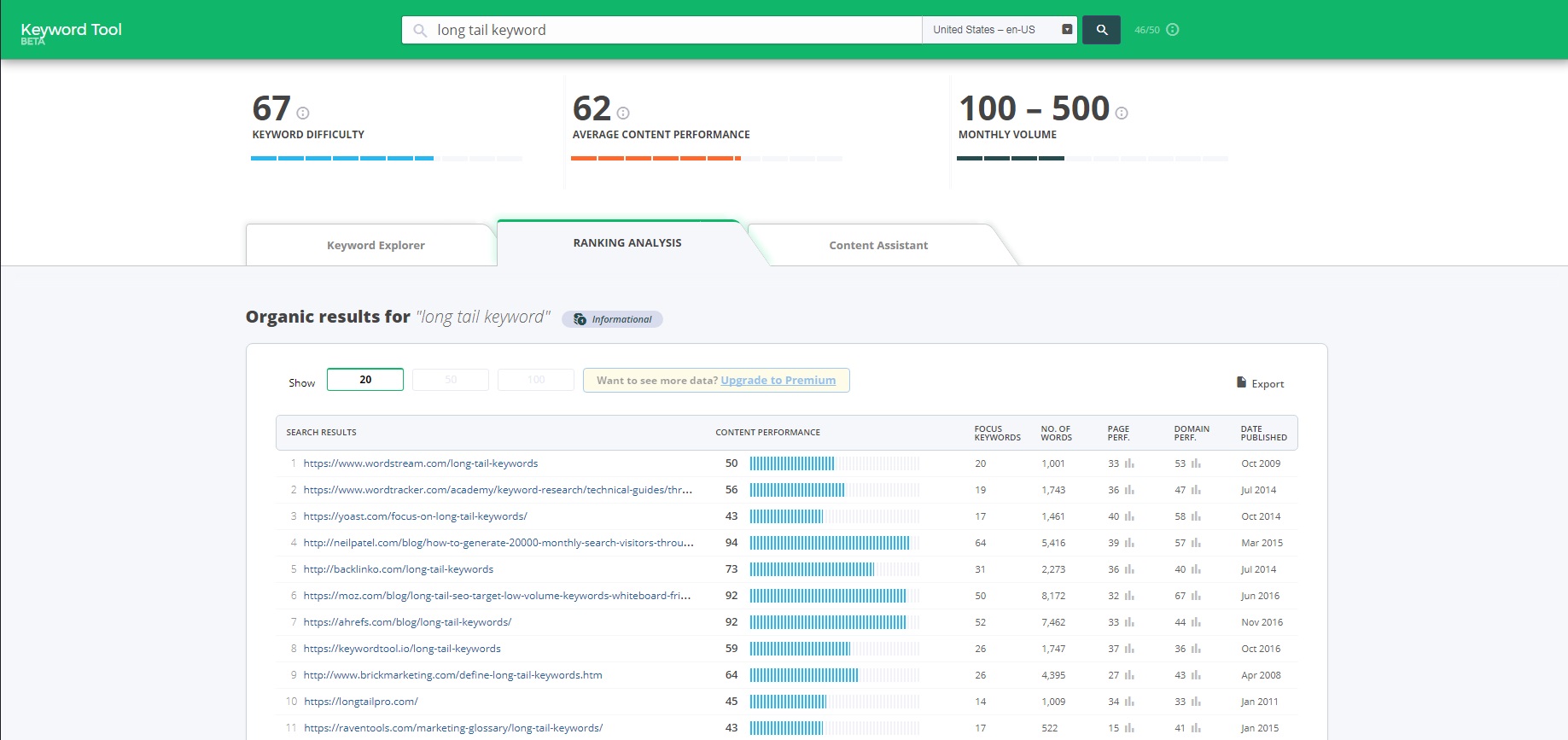 - Average Content Performance – In this part, they show you the average content performance score of the top ranking websites for the keyword. They measure it using a scale of 0 – 100. This means that the lower the average performance score is, the easier it is for you to rank for the keyword using the content. The term “long tail keyword” has an average of 62 out of 100.