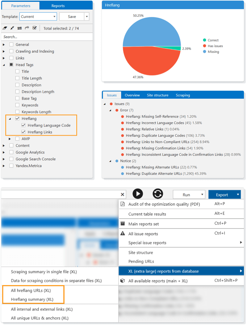 Based on this data, you can spot nine new issues. For example, hreflangs inconsistent with the language code in confirmation URLs, which means that the target URL’s language code is not consistent with the language code of incoming hreflang links. The spider will show you this issue and eight more of them. And if you want to get all the data at once without filtering by a specific issue, you can export extra-large reports with all hreflang URLs and hreflang summary.