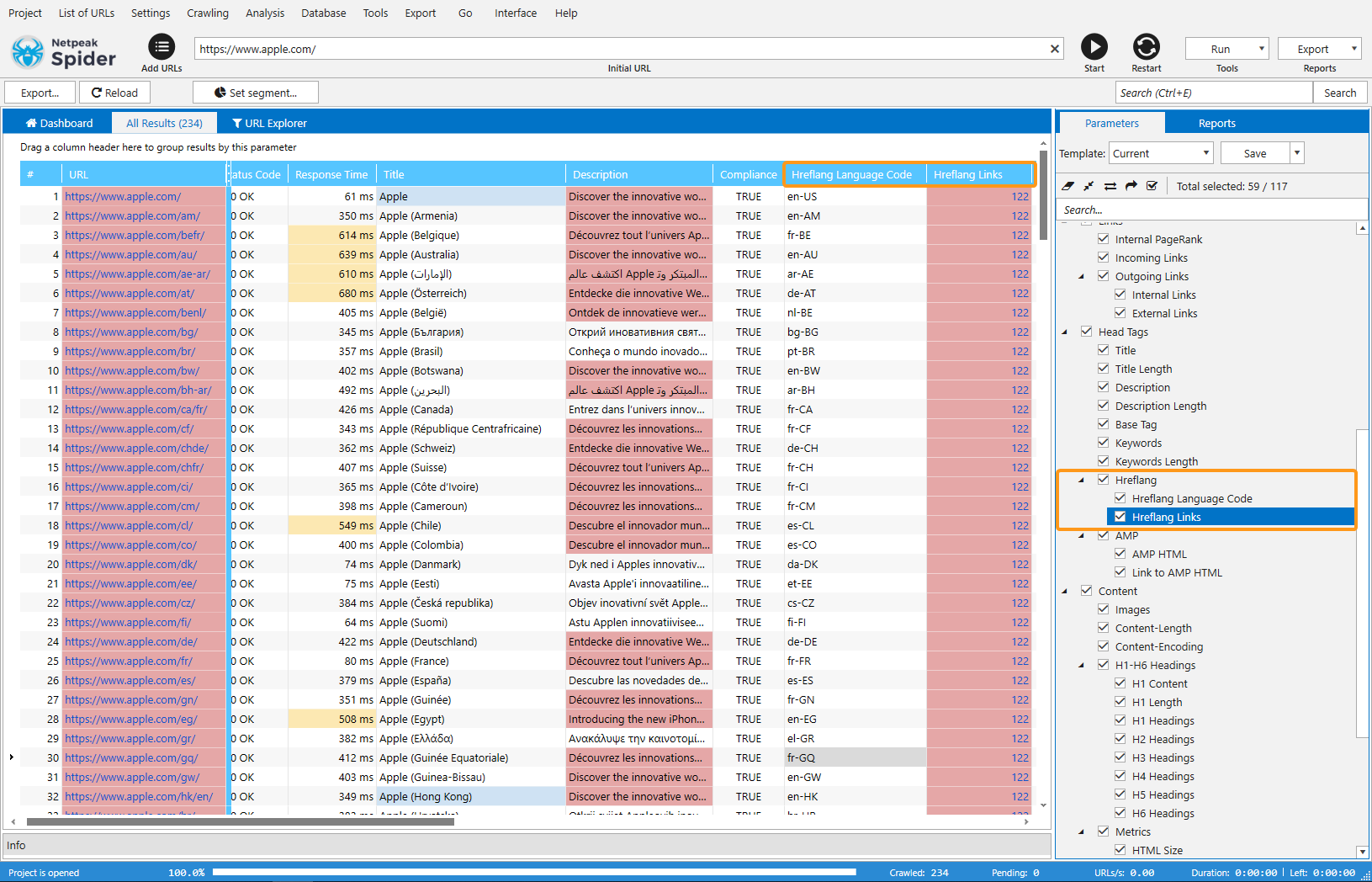 As an example of how it works, we’ll analyze an apple.com website because they have a lot of hreflangs. Go to the Parameters tab in the sidebar and turn on hreflang parameters in the ‘Head Tags’ group. Spider collects this data from the web pages and adds them to the table as usual.