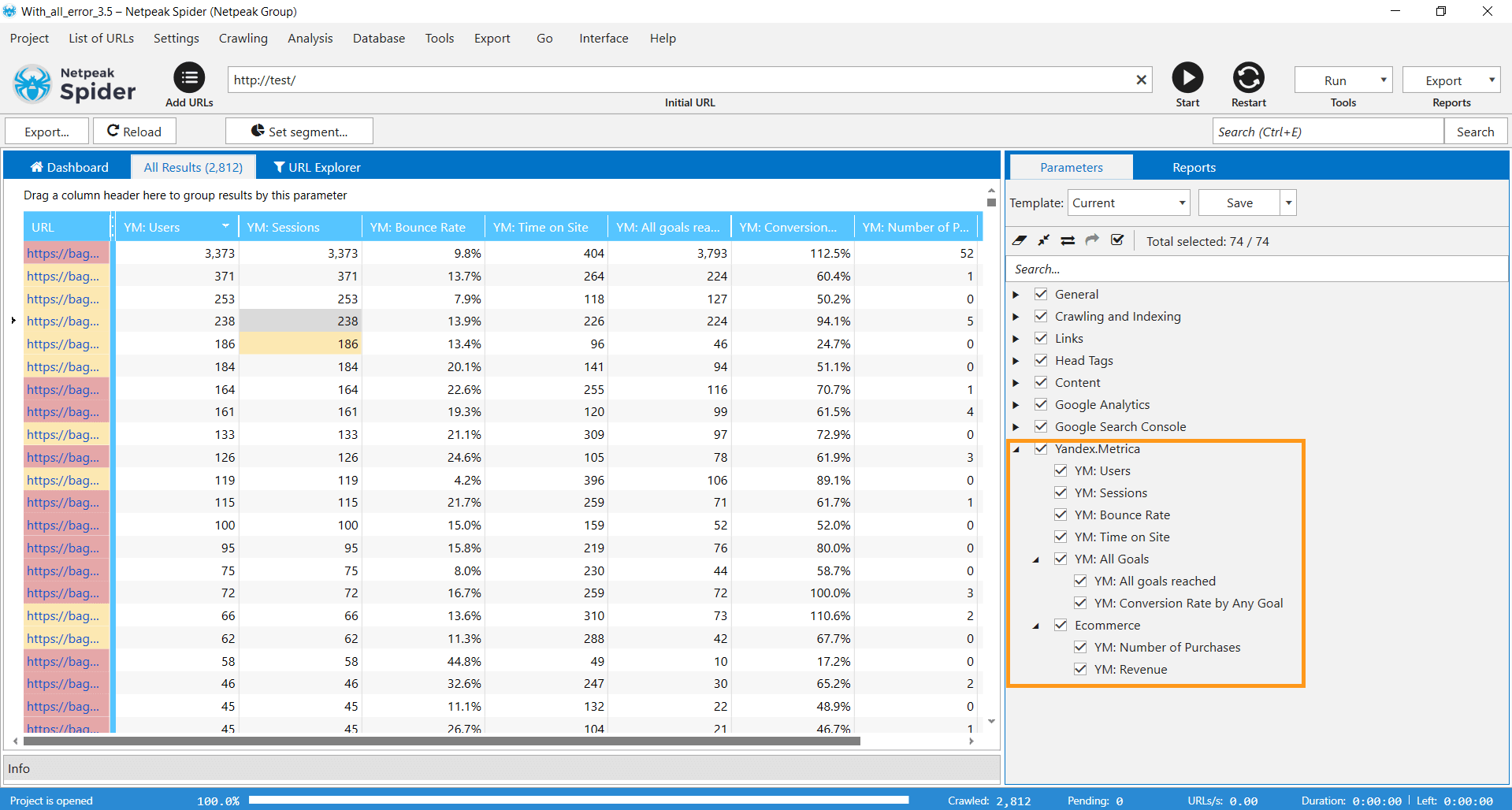 The third feature is integration with Yandex.Metrica. It’s a very popular analytics system for websites in Eastern European countries. By the way, Netpeak Spider is the only desktop SEO tool that is integrated with it. This feature works pretty much the same as Google Analytics integration.