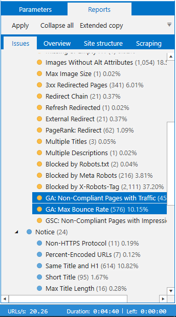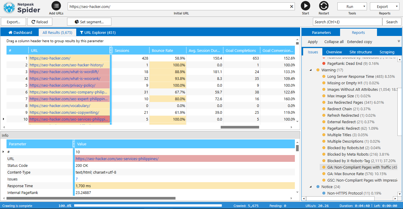 With Google Analytics connected to Netpeak Spider, you can get a variety of data regarding URLs with or without issues that are receiving traffic and URLs with high bounce rates. There are 4 main areas where you can see this report: