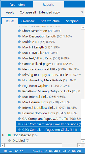 Before you start crawling, make sure you check the Google Analytics and Google Search Console boxes under Parameters in the right sidebar.