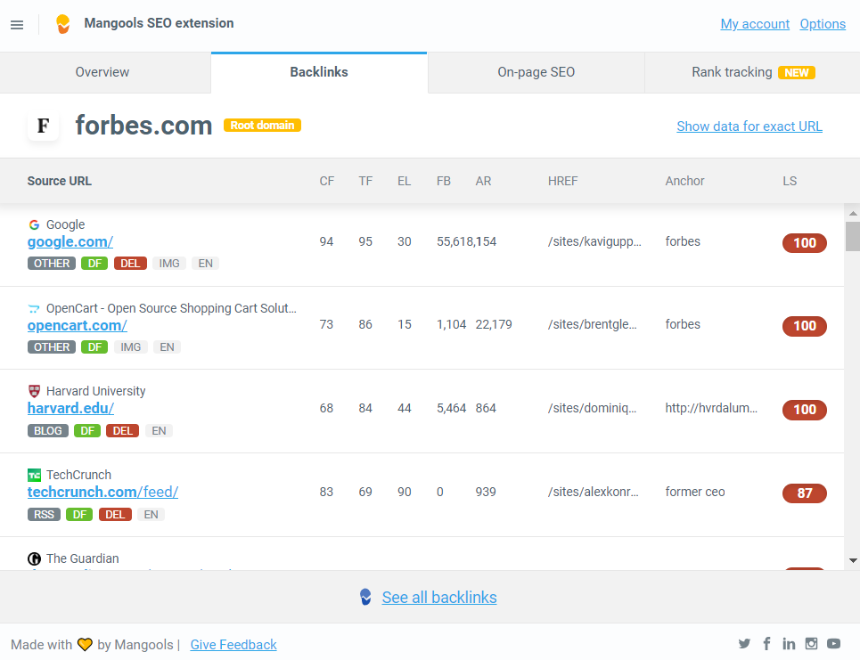 The second part of the Chrome extension allows us to view backlinks for each website, which is essential for our link building efforts. This allows you to see the ratings for each link, allowing you to track down both high and low-quality links that may affect website traffic.