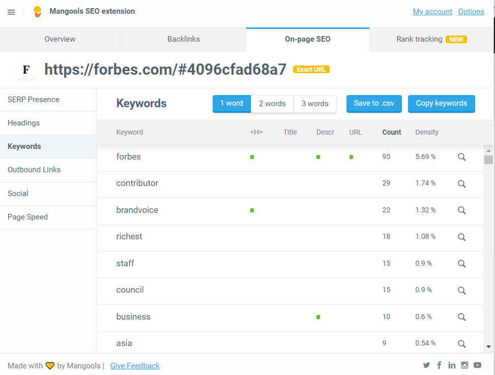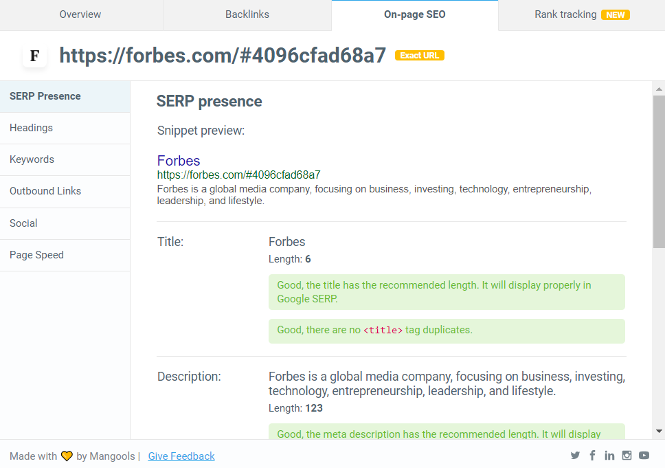 Perhaps the most in-depth feature of the Mangools Chrome extension, this section allows you to provide a quick evaluation of your website. For starters, you can view the SERP presence to see how your domain would look like in Google’s search results, and search for header tags. This feature works in a way that reminds me of website audit tools such as Woorank and Google Lighthouse, as it provides you with a concise assessment of your website.