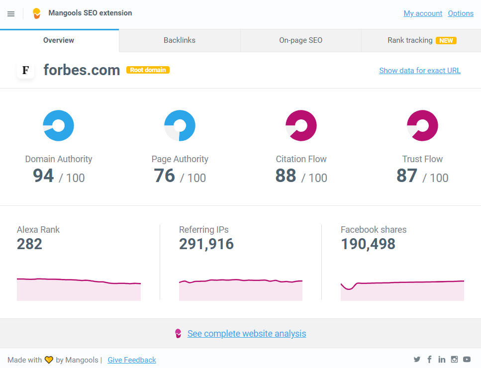 The first part of this tool is the Overview, which allows you to see general page info such as domain authority, page authority, trust flow, and citation flow. Along with these, you also get to view the Alexa Rank, referring IPs, and the number of Facebook shares. You also have the option to show data for an individual web page, or for the domain itself.