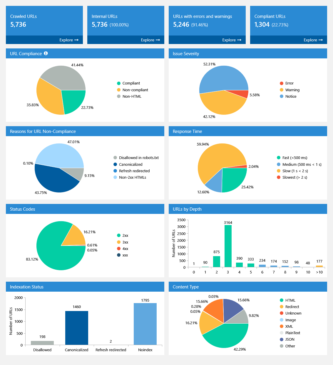 A look at the crawl overview provides you with quick stats on your website. You are provided a series of easy to digest graphs that help you understand the performance of your web pages. These graphs give you all the important statistic that you need to know, and clicking on each section of the graph allows you to view the links that are part of it.