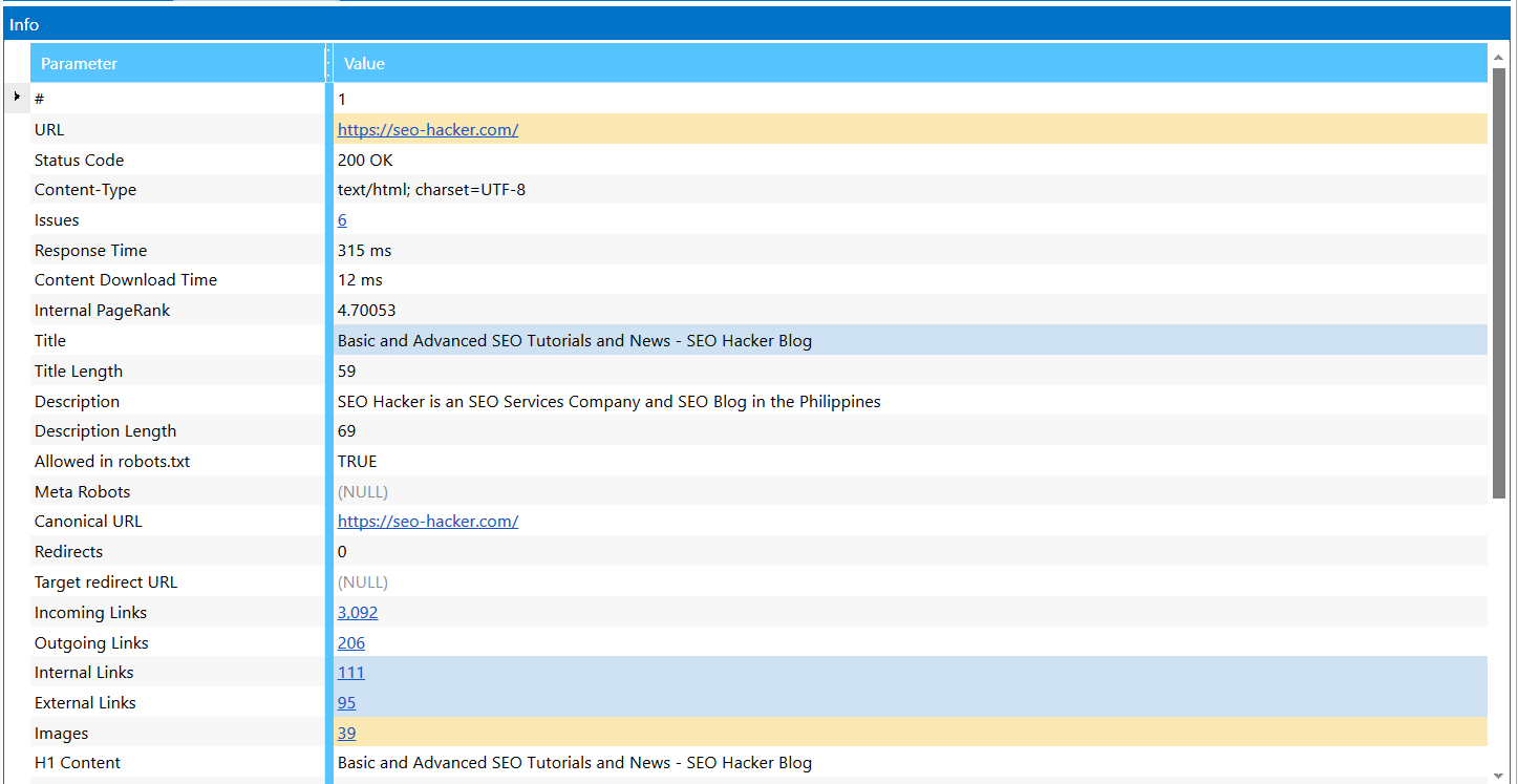 Upon looking at the data, I’m able to view important details such as response and download time, description, outgoing and incoming links, and other important content such as page description. One thing I like is that Netpeak Spider uses color to indicate which parts of your webpage have things that need a deeper look, or if there’s an error that needs to be resolved.