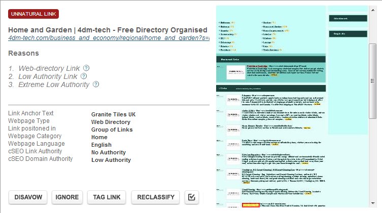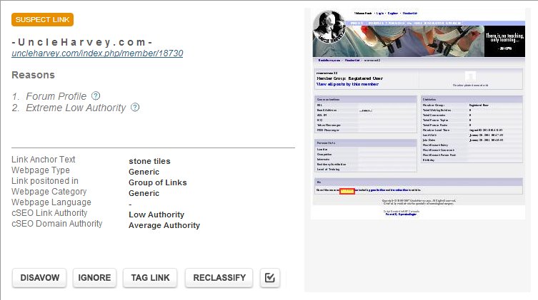 It can even pull an image of the page that the link comes from. At the bottom, you can select which action you’d like to take. You can choose to either DISAVOW, IGNORE, OR RECLASSIFY (in this case, either Unnatural or Suspect) the link or the entire domain if you wish. You can even add tags and add a to-do item.