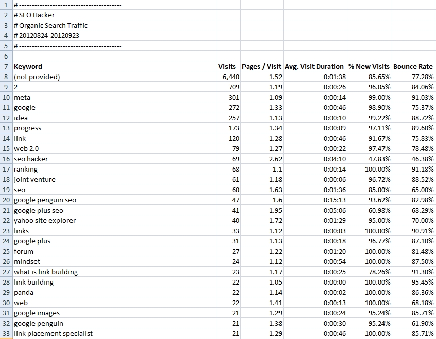 Copy all of the keywords you have that are providing you with traffic. Of course, don’t include (not provided) in the list because those are the keywords that are hidden from you by Google’s privacy conditions. Sucks, right? It amounts for almost 50% of my traffic.
