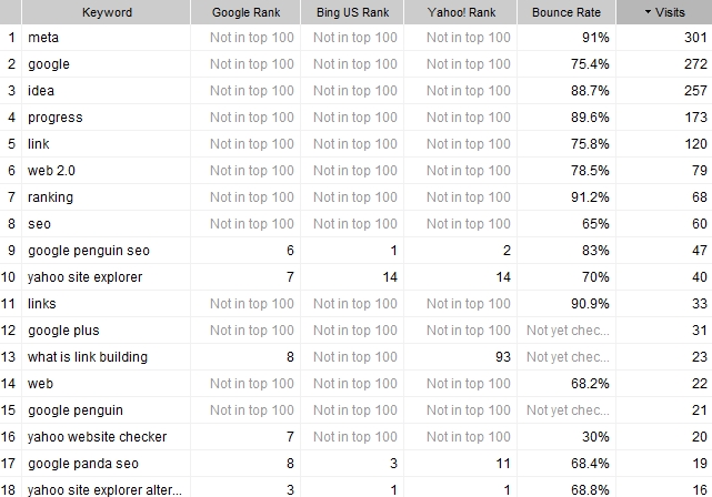 It churns out my keyword rankings in Google, Yahoo and Bing. Plus, I can see how many people visited through those keywords using Rank Tracker’s cool new feature: Google Analytics integration.