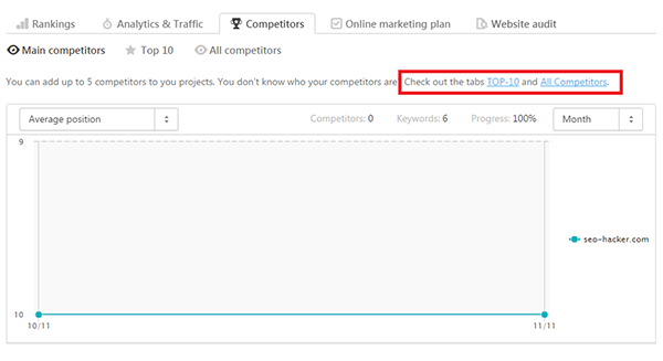 What’s more cool with this tool is that if you don’t know who exactly your competitors are for specific keywords, you could just click the ‘TOP-10’ or ‘All Competitors’ under Competitors tab and it will automatically generate a list of your competition.