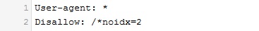 Disallowing sections of the site can lead to great results. It’s easy, fast, and reliable. The best way to do this is to set a custom parameter to appoint all the varying combinations of facets and filters that you want to block (e.g. “noidx-2”). You can then incorporate it to the end of each URL you want to block or you can use a meta robot noindex tag in the headers to set the pages that you want to be blocked. You can then enter the disallowed custom parameter into your robots.txt file. It looks like this: