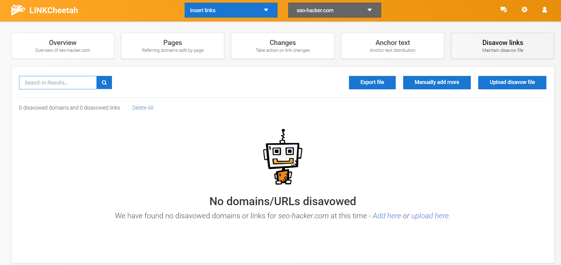 The last feature is the disavow links tool, which is the place where you can see links that you have disavowed from the pages section. As of this review, there have been no disavowed links. However, the option to add these links is a simple process, as you can disavow links with just a few clicks.