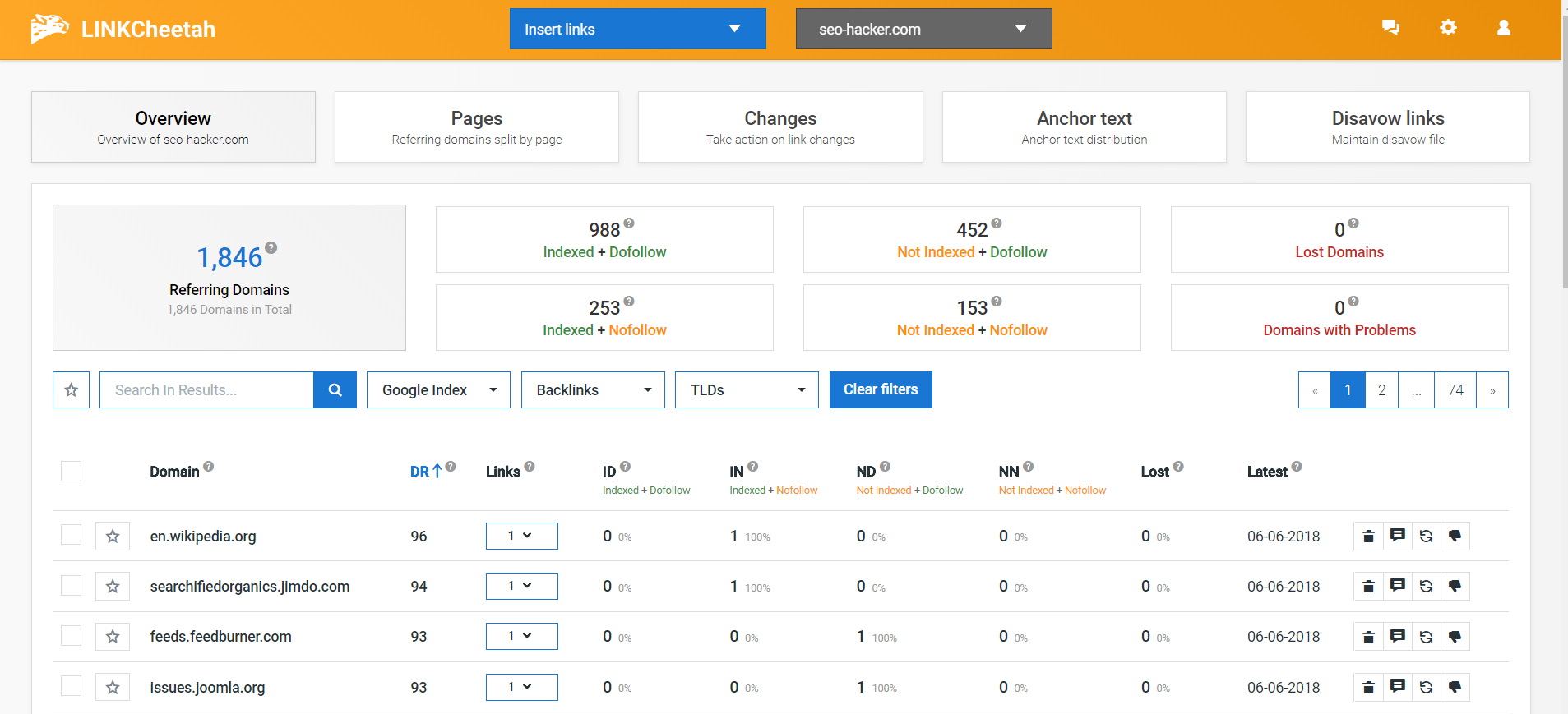 Once Link Cheetah has processed all of your website’s backlinks, you can now browse through them on the Overview page. From here, you can view all of the referring domains, check their Ahrefs domain rank score, and track dofollow, nofollow, and indexed links. If you want to take a look at a specific domain, you can enter the URL in the search bar, and filter the results through various options, such as only view the indexed and dofollow links, or view nofollow links that have not been indexed by Google.