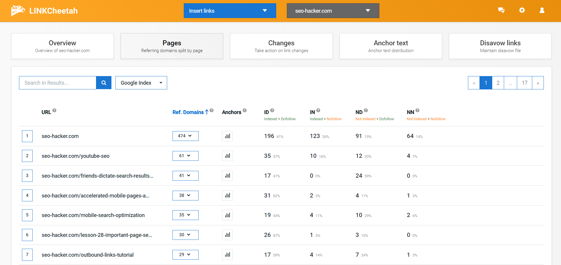 The second important feature of Link Cheetah is the Pages section, which allows you to identify the links that are present within a specific webpage. These web pages are ranked based on the amount of referring domains within that page, and upon clicking, you can view these referring domains, while also look into the web pages that are from your website.